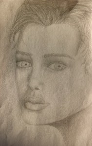 After watching some how-to videos on drawing, I came back to the original model recharged, drawing her several more times, altering hair and even the shape of her eyes, which was one of the things that I liked most about model 1 in the first place, but still I couldn’t get her right. I thought that if I just kept changing things, eventually she would look like the girl I saw in my head, and I wasn’t willing to give up… that is, until I was about half way through this drawing–the last drawing of model 1 ever made.